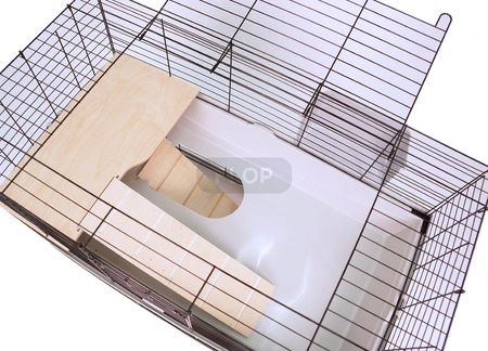Kraty można złożyć na płasko co ułatwia transport. Od przodu klatki znajdują się dość duże drzwiczki, od góry również mamy otwieraną klapę - bardzo dużą umożliwiającą wygodne wykonywanie wszelkich czynności. W zestawie znajduje się również dodatkowa drewniana półka oraz schodki (2 szt.). Schodki są dość strome i śliskie, nie wszystkie zwierzęta będą się na nich dobrze czuły. Jeśli Twoje zwierzę nie chce korzystać ze schodków, to możesz np. przykleić do nich kawałek wykładziny dywanowej.