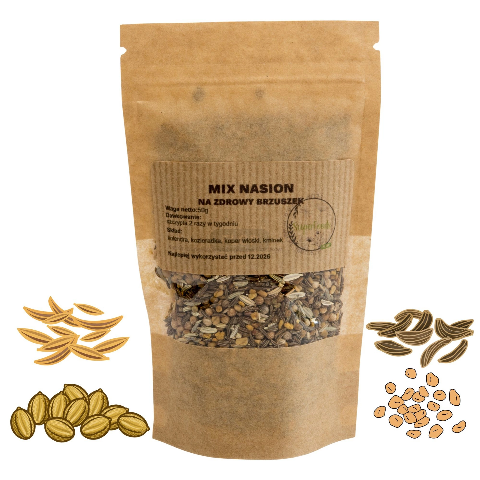 - Skład: kolendra, kozieradka, koper włoski, kminek (100% nasion)
