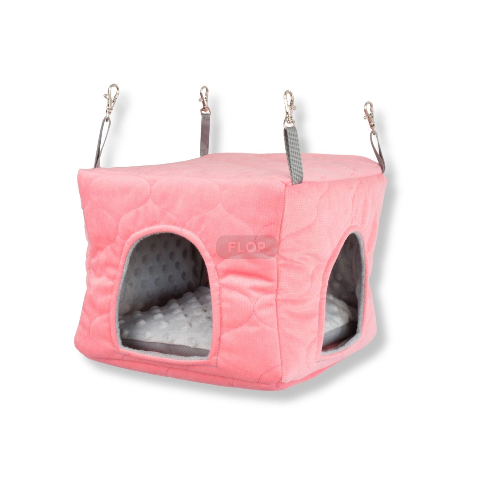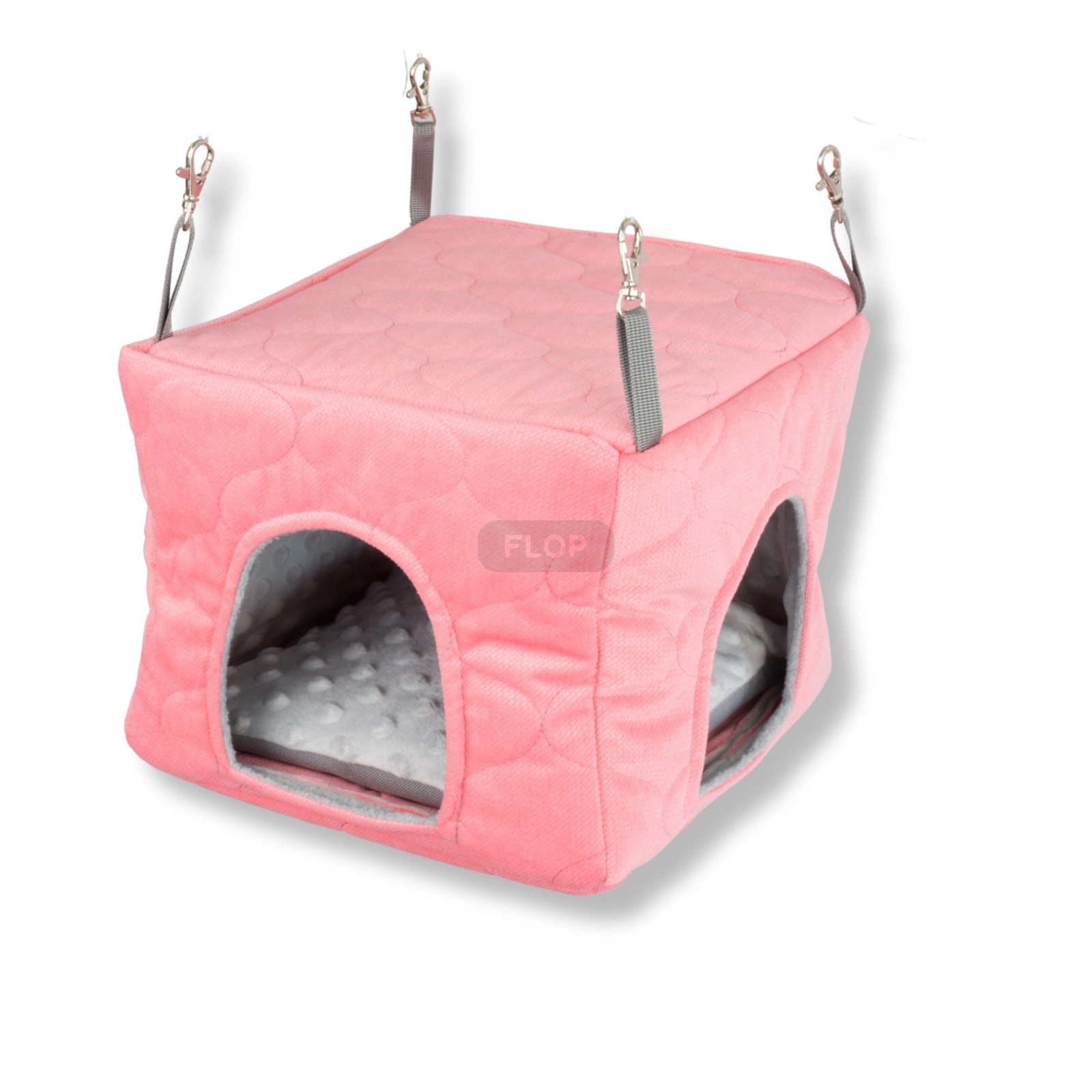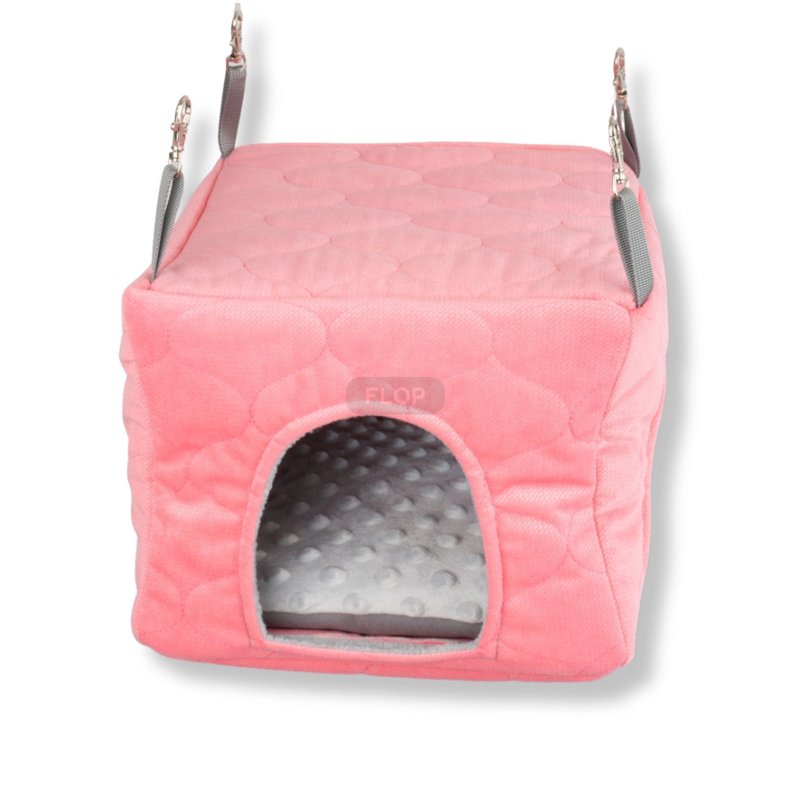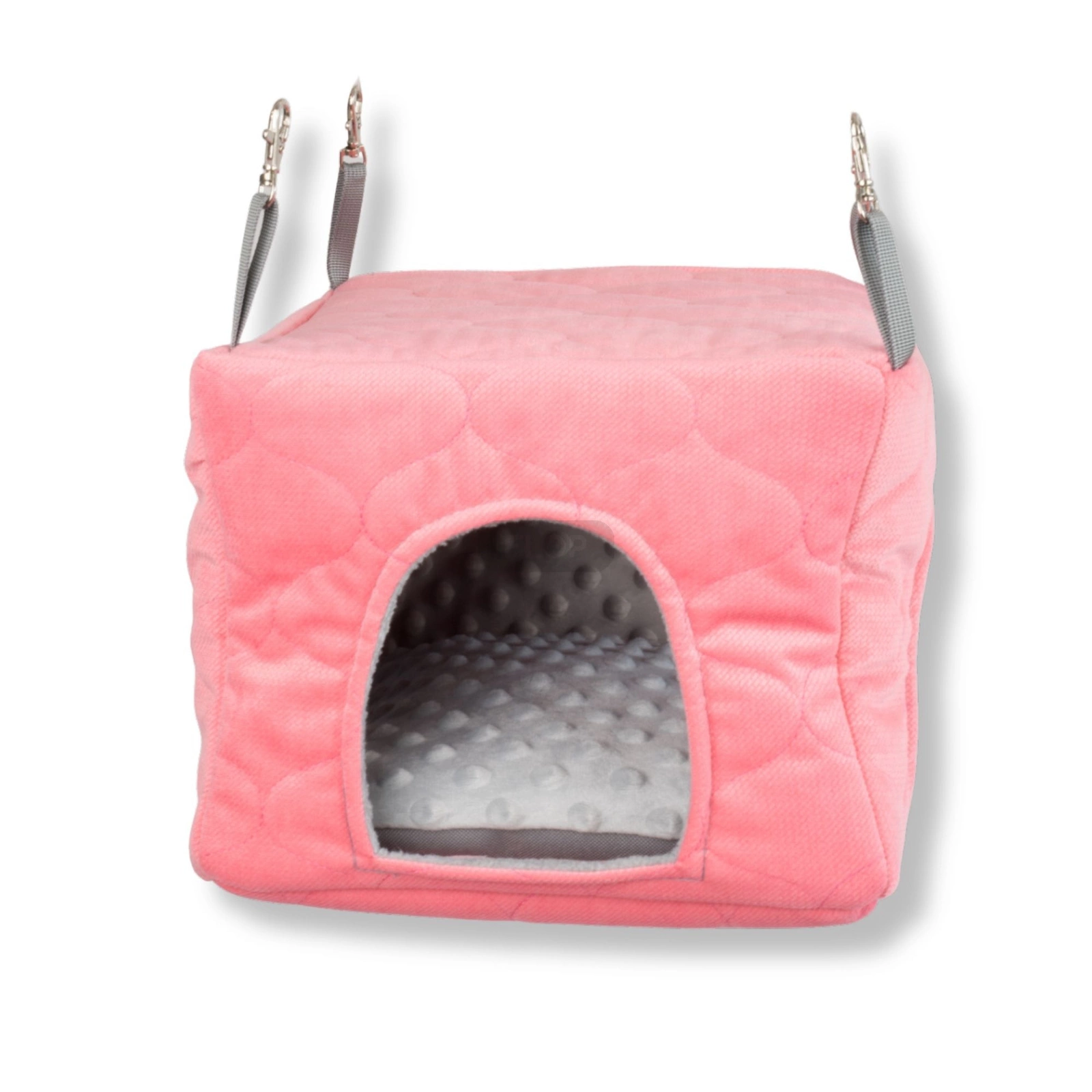 Wspaniała propozycja dla tych, którzy chcą zapewnić swoim zwierzętom miejsce, w którym poczują się bezpiecznie i komfortowo, a jednocześnie nie chcą ograniczać przestrzeni w klatce. Oferowany domek wieszany jest za pomocą czterech karabińczyków. Można go zamocować do ścianek lub sufitu klatki - należy jednak pamiętać o tym, że może być potrzebne przedłużenie uchwytów (można wykorzystać sznurek, wstążeczkę czy też - preferowane przez nas - łańcuszki kulkowe).
