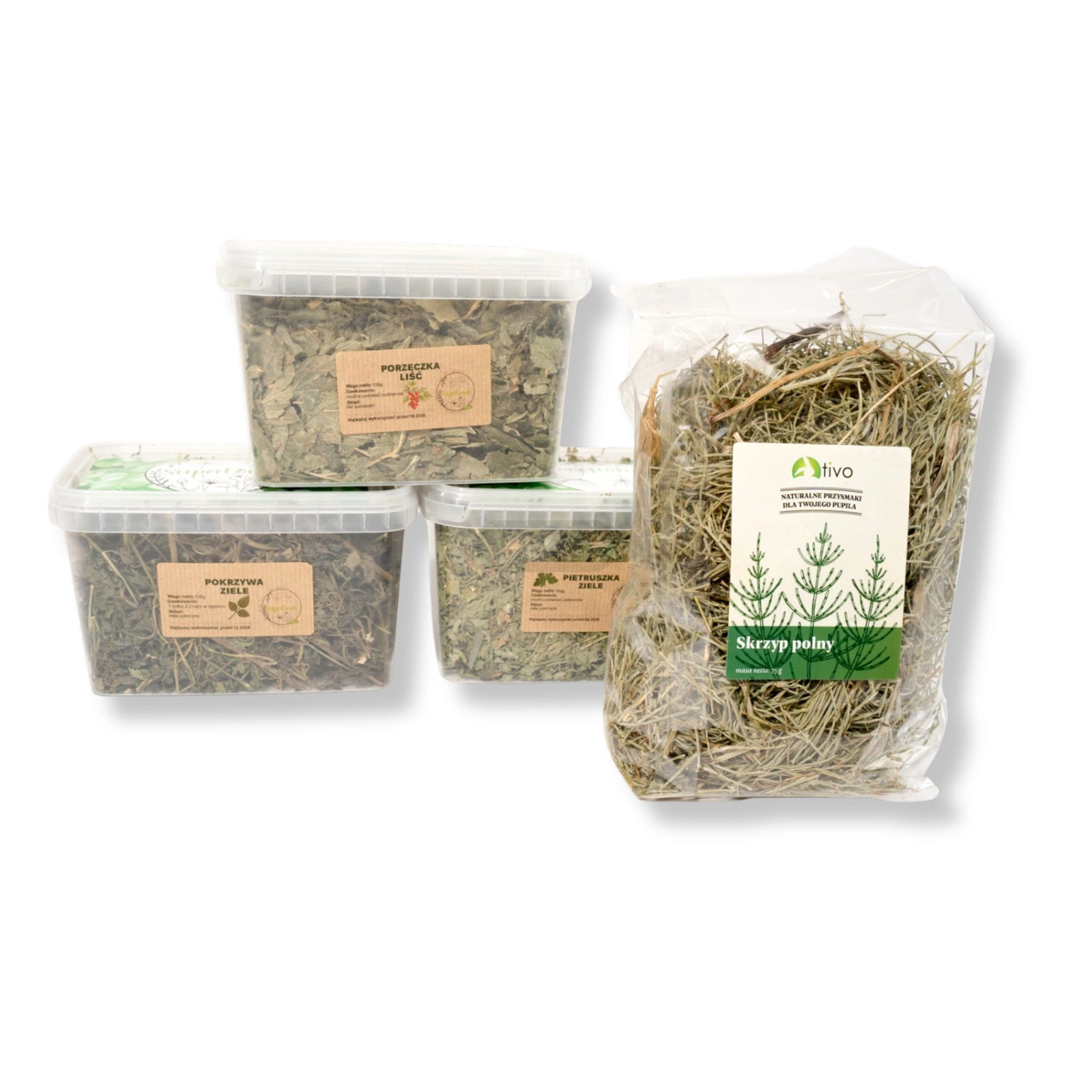 Układ moczowy królika jest bardzo delikatny – każdy opiekun wie, jak łatwo o złogi wapnia czy osady w moczu. Dlatego profilaktyka ma ogromne znaczenie. Ten zestaw to cztery naturalne składniki, które od wieków wykorzystywane są w ziołolecznictwie do wspierania pracy nerek i dróg moczowych.