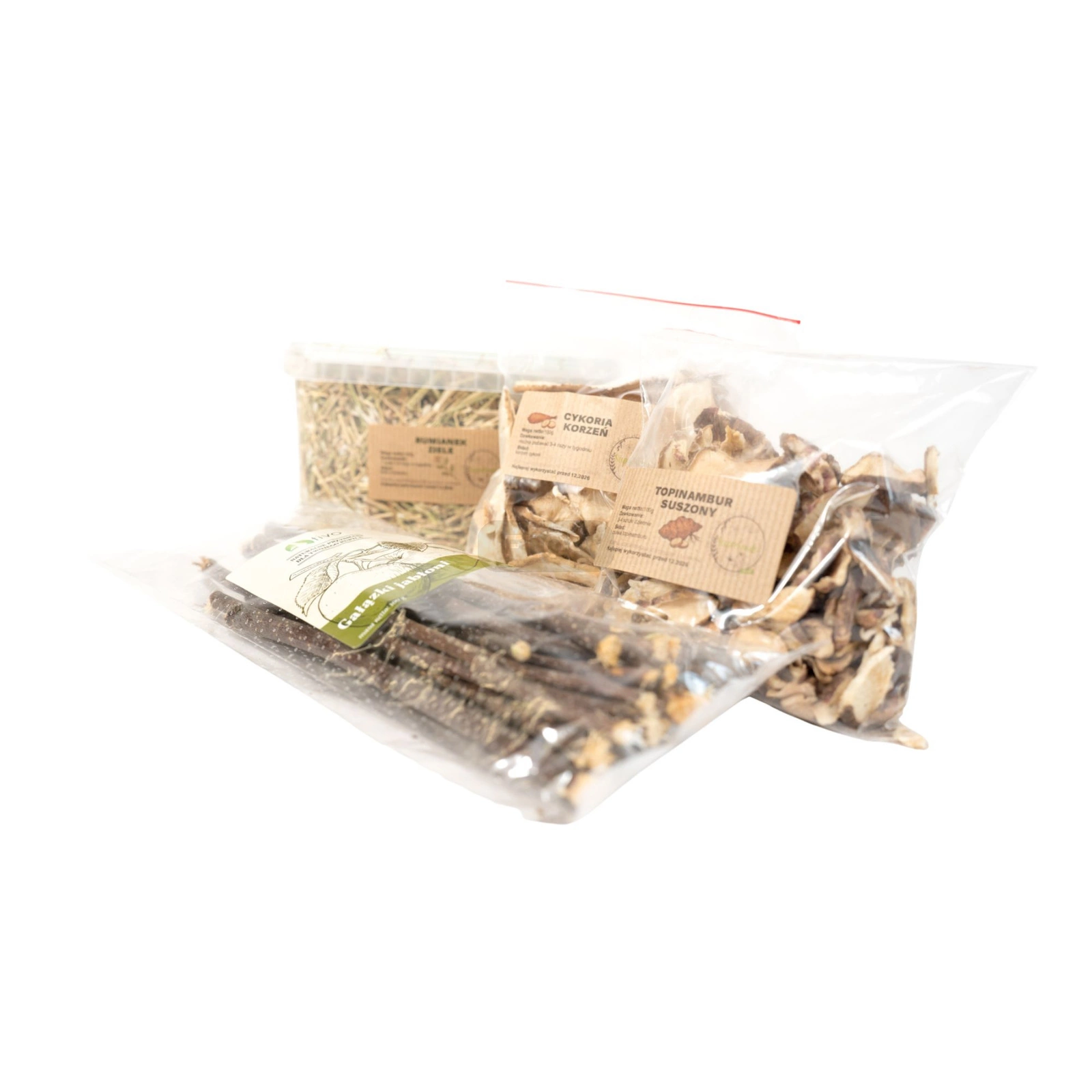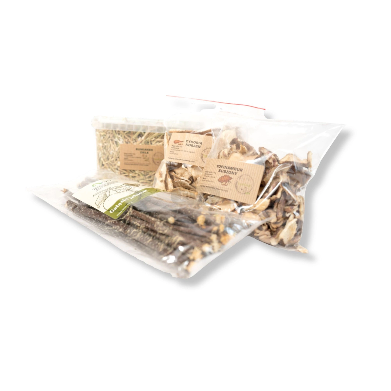 - Naturalny zestaw dla zdrowych zębów królika! Cykoria podróżnik, rumianek, korzeń mniszka i gałązki jabłoni wspierają trawienie, łagodzą dolegliwości i przede wszystkim pomagają w naturalnym ścieraniu stale rosnących zębów. ?