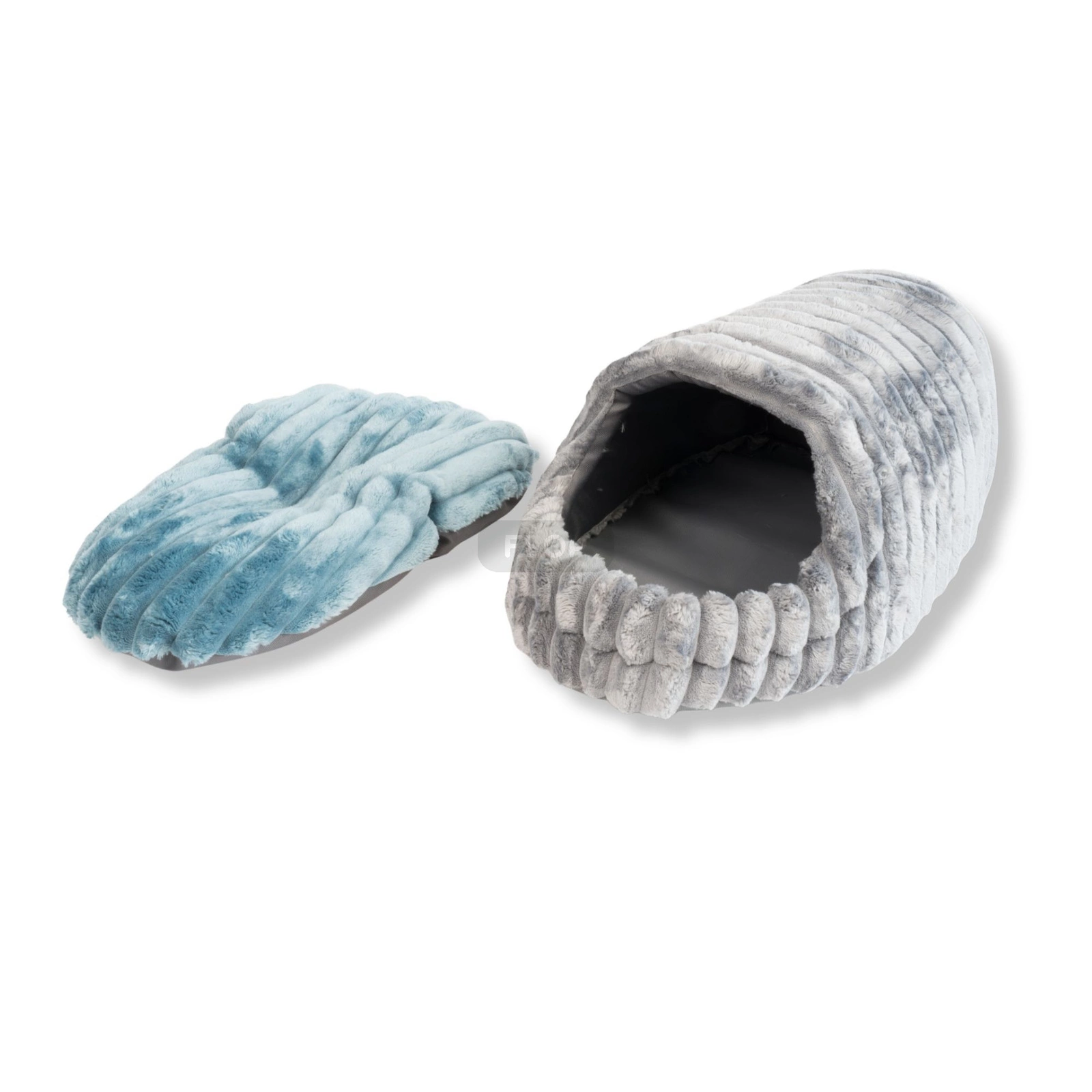 Wielka przytulna budka z polaru minki stripes (szary z niebieską poduchą)
